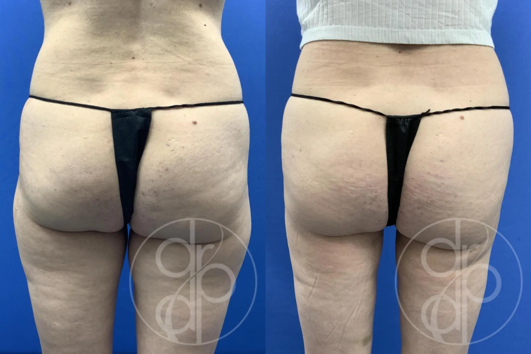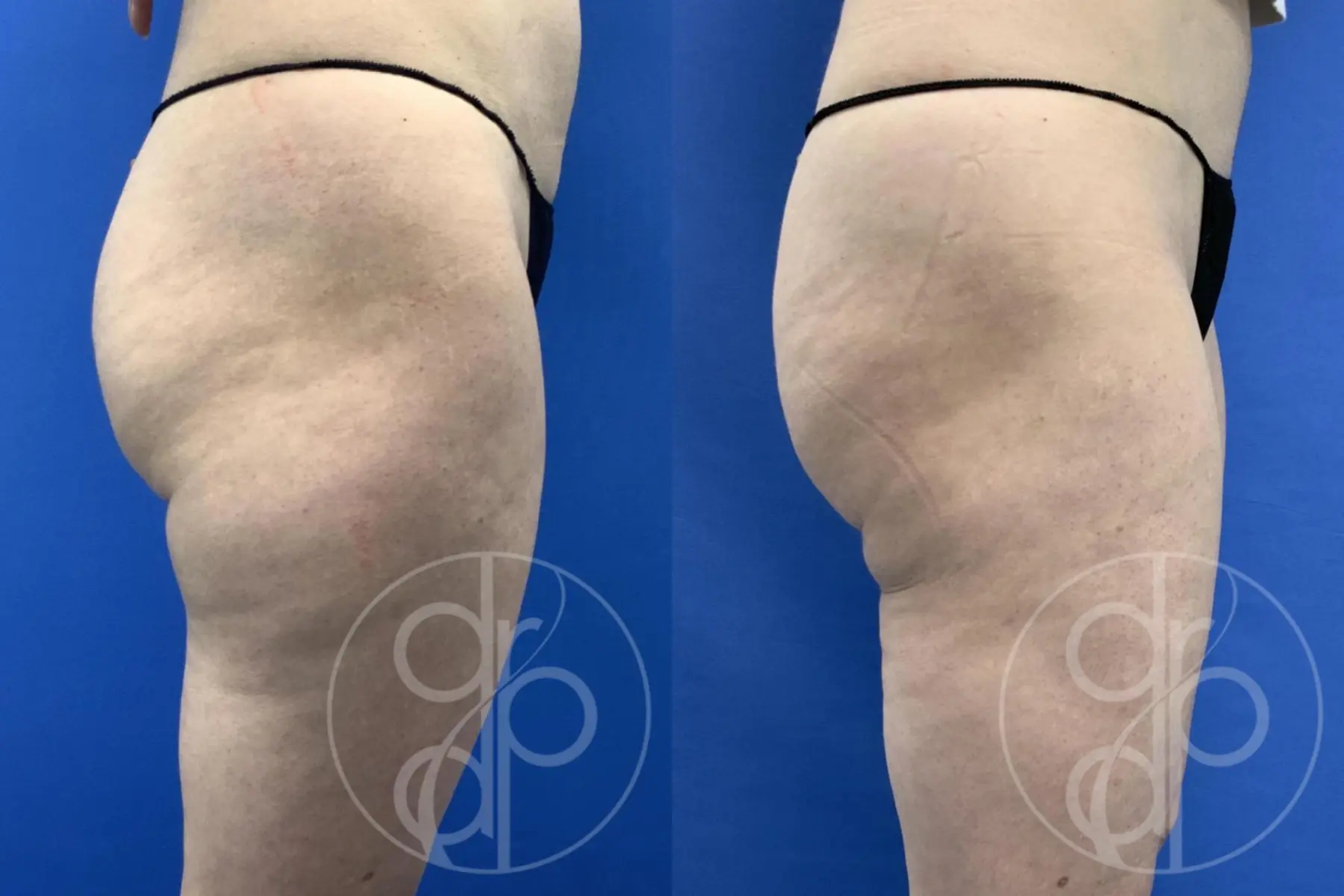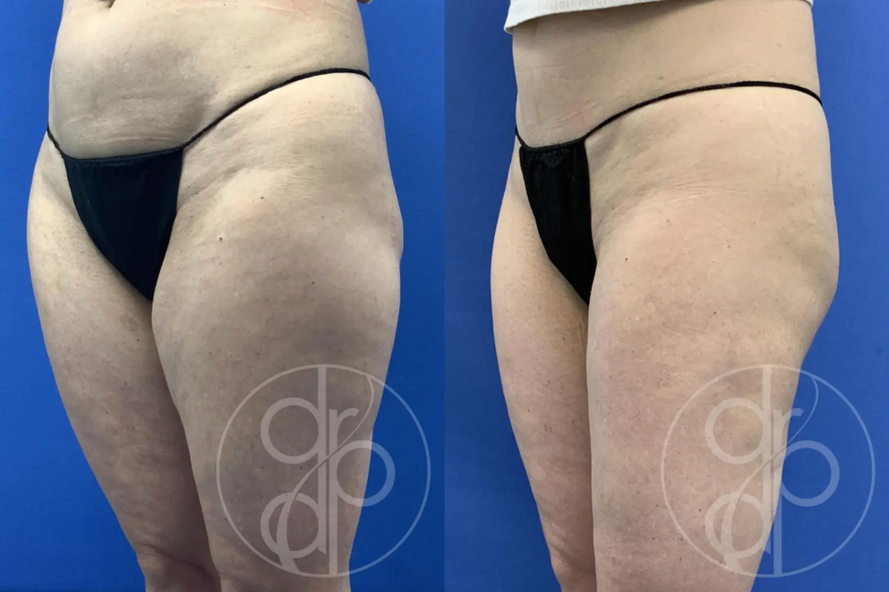- Technique: Liposuction to inner/outer thighs, below the buttocks, and inner knee area