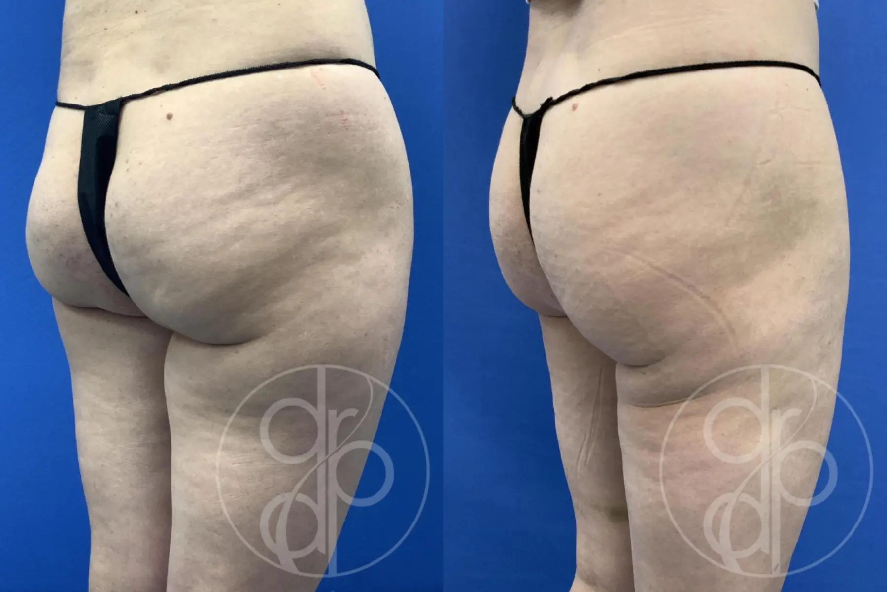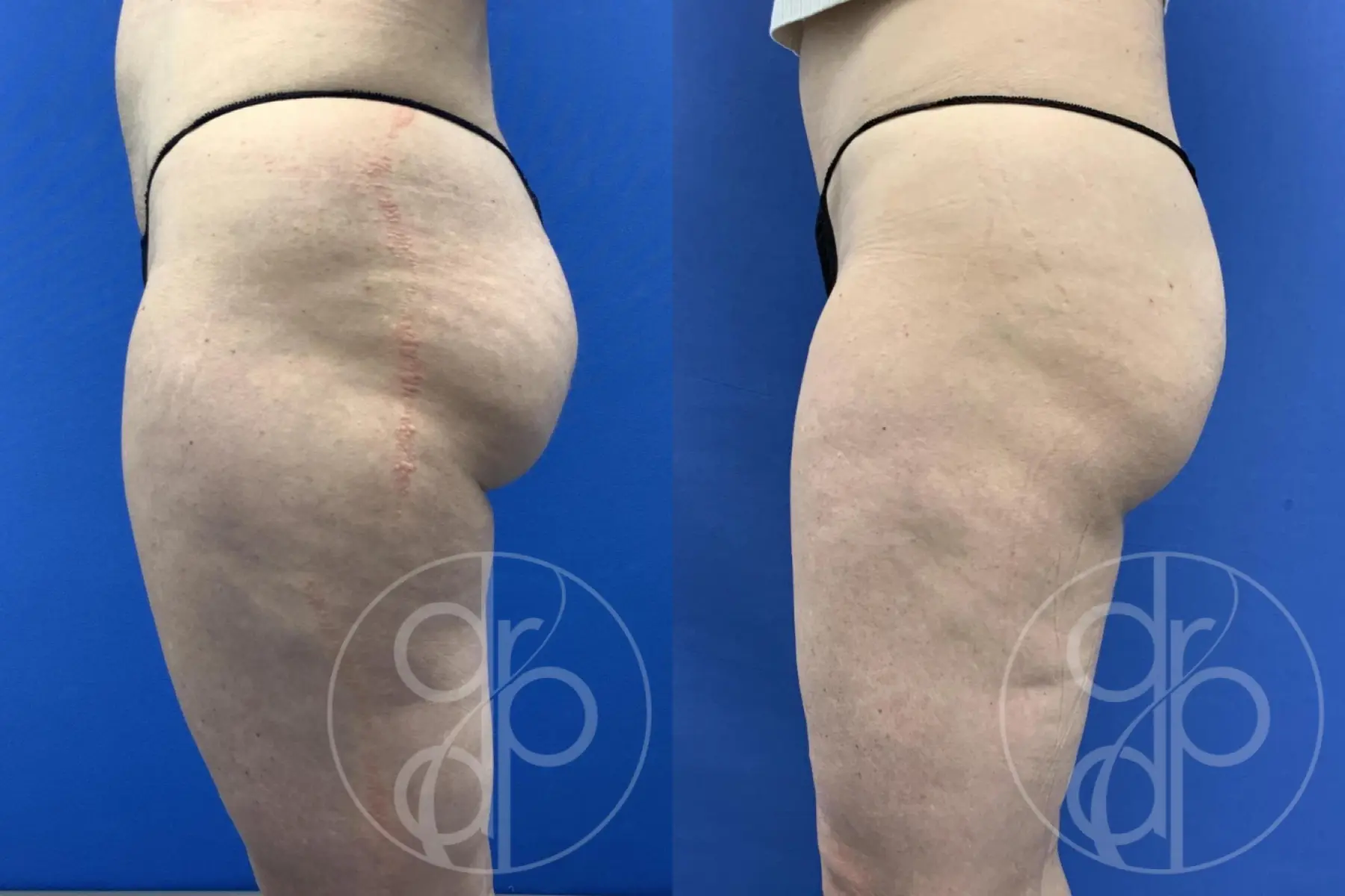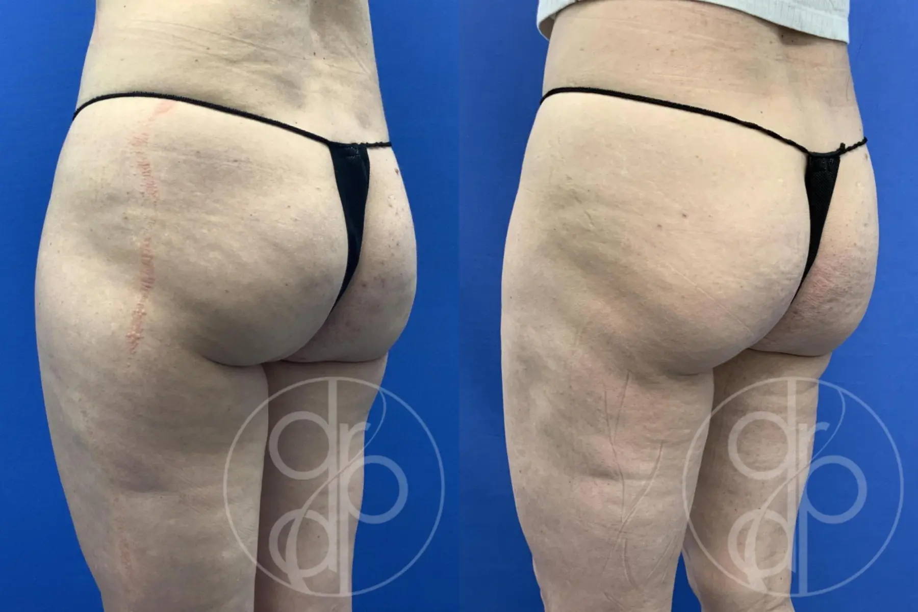 - Technique: Liposuction to inner/outer thighs, below the buttocks, and inner knee area
